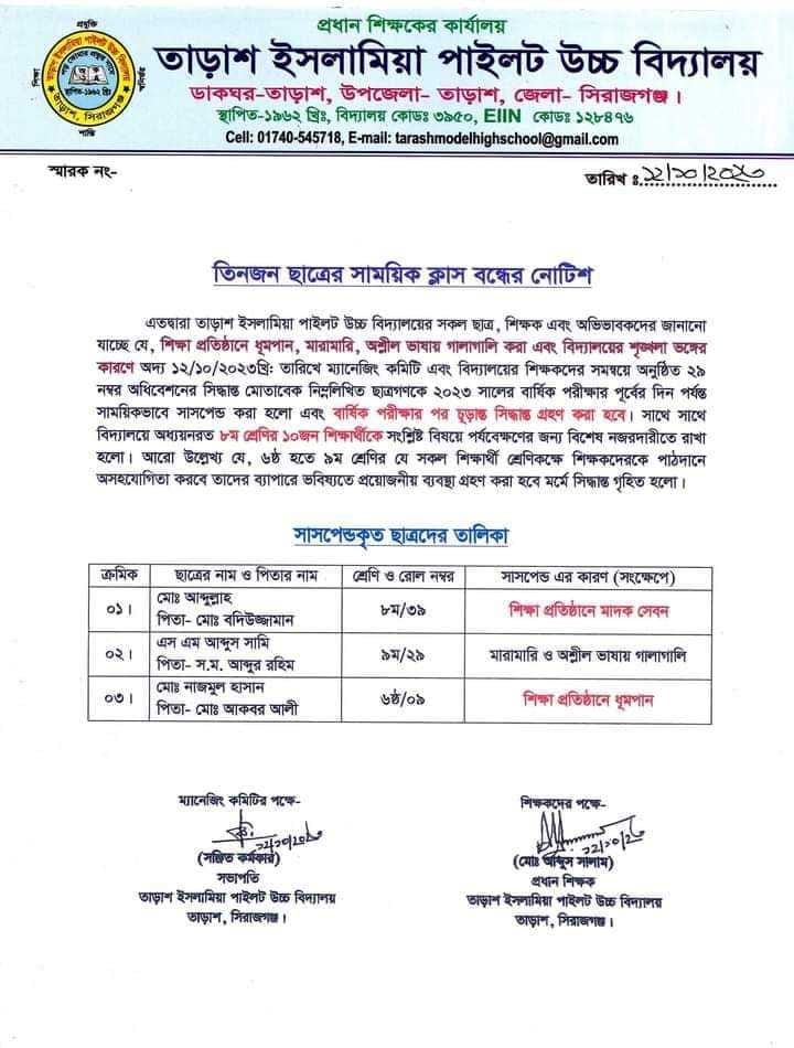 তাড়াশে মাদক সেবন ও শৃঙ্খলা ভঙ্গের দায়ে ৩জন ছাত্র সাময়িক বহিস্কার