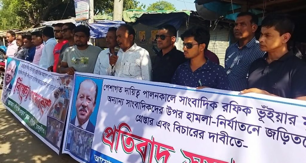 মানববন্ধনে বক্তারা, ২৮ অক্টোবর ঢাকায় বিএনপির সমাবেশ স্থলে সিনিয়র সাংবাদিক রফিক ভুঁইয়ার মৃত্যুতে গভীর শোক প্রকাশ করে তার পরিবার বর্গের প্রতি গভীর সমবেদনা জ্ঞাপন করেন। এসময় সারা দেশে সাংবাদিকদের উপর হামলা ও নির্যাতনের ঘটনায় জড়িতদের খুঁজে বের করে দৃষ্টান্তমূলক শাস্তি প্রদানের দাবি জানান।অন্যথায় আরো বৃহত্তর আন্দোলনের ঘোষণা দেন বক্তারা।