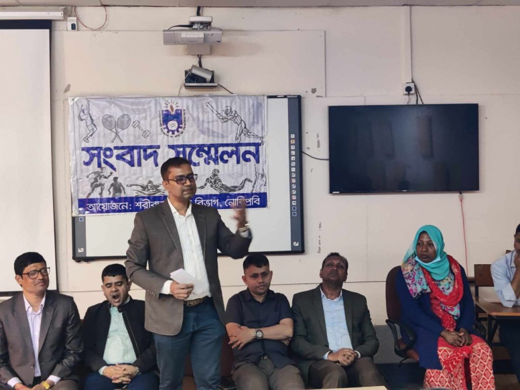 আন্তঃবিশ্ববিদ্যালয় ক্রিকেট টুর্নামেন্টের দল ঘোষণাসহ বিভিন্ন বিষয় নিয়ে প্রথমবারের মত সংবাদ সম্মেলনের আয়োজন করেছে নোয়াখালী বিজ্ঞান ও প্রযুক্তি বিশ্ববিদ্যালয়ের (নোবিপ্রবি) শরীরচর্চা শিক্ষা বিভাগ।