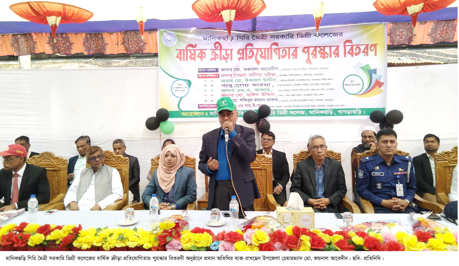 মানিকছড়ি গিরি মৈত্রী সরকারি কলেজে বার্ষিক ক্রীড়া প্রতিযোগীতা বিজয়ী হাতে পুরস্কার বিতরণ করেন উপজেলা চেয়ারম্যান জয়নাল আবেদীন