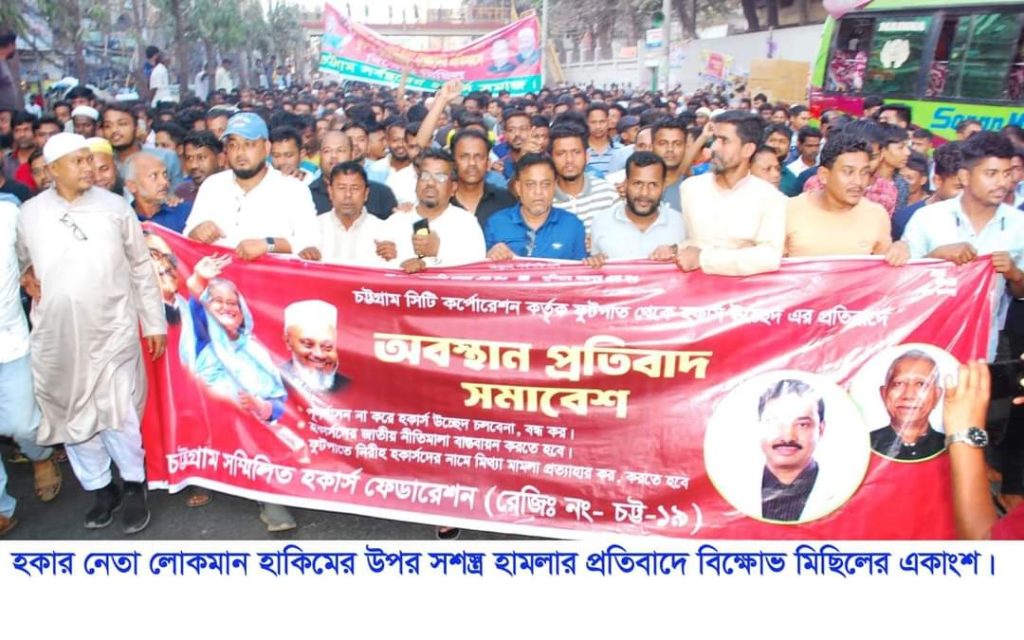 চট্টগ্রাম ৪ মার্চ ২০২৪ ইং সোমবার বিকাল ৩ টায় স্টেশন রোডস্থ নতুন রেল স্টেশন চত্বরে টেরিবাজার আন্দরকিল্লা হকার্স সমিতির সাধারণ সম্পাদক লোকমান হাকিমের উপর সন্ত্রাসী হামলার প্রতিবাদে প্রতিবাদ সভা ও বিক্ষোভ মিছিল অনুষ্ঠি হয়। চট্টগ্রাম সম্মিলিত হকার্স ফেডারেশনের সভাপতি মীরন হোসেন মিলনের সভাপতিত্বে ও সাধারণ সম্পাদক শাহ আলম ভূইয়ার পরিচালনায় অনুষ্ঠিত সভায় বক্তব্য রাখেন- যুগ্ম সাধারণ সম্পাদক নুর মোহাম্মদ, হাবিবুর রহমান, সাংগঠনিক সম্পাদক শফিকুর রহমান, সহ সাংগঠনিক সম্পাদক মো. শাহীন আহমেদ, মো. মাসুম, কার্যকরি সদস্য মো. আনোয়ার, ডবলমুরিং থানা আঞ্চলিক কমিটির আহ্বায়ক মুজিবুর রহমান, যুগ্ম আহ্বায়ক আমির হোসেন বাচ্চু, মো. দেলোয়ার হোসেন, মো. দিদার, মো. মহিউদ্দিন, চট্টগ্রাম মেট্রোপলিটন হকার্স সমিতির ৫নং শাখা কমিটির সভাপতি আব্দুর রাহিম, জসিম উদ্দীন সিকদার, মো. আনোয়ার হোসেন, আব্দুল কাইয়ুম, মো. আলী, ওমর ফারুক, মো. ইউসুফ, আবুল কালাম, মো. মাসুদ, ২২নং শাখা কমিটির সাধারণ সম্পাদক মো. ইসহাক, ২৬নং ছাতা মার্কেট কমিটির সাধারণ সম্পাদক শাহাদাত হোসেন প্রমুখ। বক্তারা বলেন- সর্বস্তরের হকার্স শ্রমিকদের উত্থাপিত ৬ দফা দাবি বাস্তবায়নে ঘোষিত কর্মসূচি বানচাল করার উদ্দেশ্যে কথিত সম্মিলিত ব্যবসায়ী পরিষদ নেতার মুখোশধারী, জামায়াত সমর্থিত ব্যবসায়ীরা জাতির জনক বঙ্গবন্ধু শেখ মুজিবুর রহমানের ঐতিহাসিক ৭ই মার্চের ভাষণ চলাকালে হকার নেতা লোকমান হাকিমকে সশস্ত্র হামলা করে জোরপূর্বক দোকান বন্ধ করে লেলিয়ে দেওয়া সন্ত্রাসীদের দিয়ে মালামাল লুণ্ঠন করতে গেলে হকার নেতা বাধা দিলে উপস্থিত সন্ত্রাসী ও গুন্ডারা অতর্কিতভাবে চট্টগ্রাম সম্মিলিত হকার্স ফেডারেশনের সহ দপ্তর সম্পাদক টেরিবাজার আন্দরকিল্লা হকার্স সমিতির সাধারণ সম্পাদক লোকমান হাকিমের উপর হামলা চালিয়ে প্রাণনাশের হুমকি দেয়। এবং বলেন, ভবিষ্যতে যদি বঙ্গবন্ধুর ভাষণ আন্দরকিল্লা বক্সিরহাট এলাকায় প্রচার করো তোমাকে এলাকা থেকে উৎখাত সহ দোকানপাট জ্বালিয়ে দিবে বলে হুমকি দেয়। তার প্রতিবাদে চট্টগ্রাম সম্মিলিত হকার্স ফেডারেশন প্রতিবাদ সভা ও বিক্ষোভ মিছিল করে। মিছিলটি স্টেশনরোড হয়ে দারুল ফজল মার্কেট চত্বরে এসে শেষ হয়। মিছিল শেষে বক্তারা লোকমান হাকিমের উপর হামলাকারী আইনের আওতায় আনার দাবি জানান।